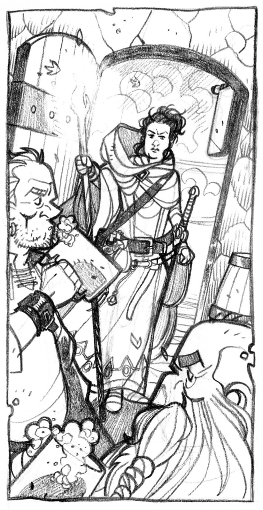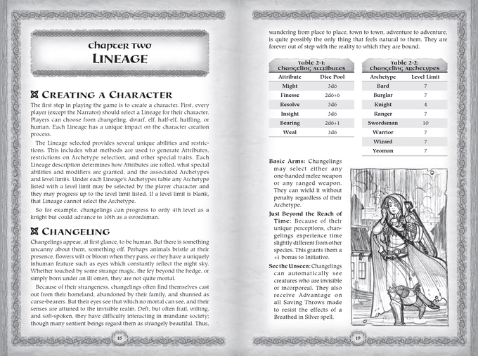 Getting into the system, there are a few tweaks the author has made to the classic formula, but if you’re at all familiar with the Dungeons and Dragons or anything D20 related this shouldn’t be all that drastic of a change. Attributes are still handled by rolling 3D6 and recording the values and bonuses but the attributes themselves look a bit different with this one than what you might expect. Instead of the usual six we have might, finesse, resolve, insight, bearing, and wealing, and you can kind of figure out which subs in for which just by looking at them. Might is strength, finesse is dexterity, insight is intelligence, bearing your charisma, and resolve your constitution. Wealing, on the other hand, is a new concept, and represents a character’s connection to a larger fate and destiny. It’s a great innovation when given the high fantasy feel the game shoots for, as a PC’s wealing bonus can be spent to give a character advantage, roll two dice and take the higher number, on a number of dice rolls equal to the bonus. It’s a nice addition that fits in well, as I’ve always thought some kind of “hero point” mechanic was missing from this style of game for quite a while now.
