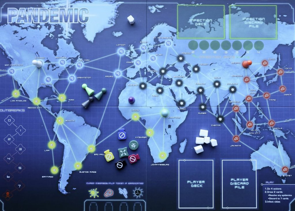 In Pandemic, you play as a team trying to eradicate the world from four deadly diseases. Either you all win, or you all lose. There are seven possible rolls that you can play as; dispatcher, medic, scientist, researcher, operations expert, contingency planner, or quarantine specialist. Each roll has their own unique traits.
