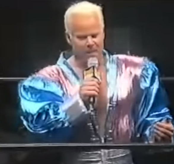 Match Three: Julio Fantastico, whose hero is he again? VS 2 Cold Scorpio. Scorpio is the former Flash Funk from the WWF and was let go from there because of a bad drug problem, so if you’re picking up yet another theme here, good on you. Scorpio is announced as the champion of absolutely nothing yet comes to the ring with a very cheap looking WCW championship belt replica. It’s never mentioned at all, it’s never addressed by the announcers, so fuck it, it’s just a big ass piece of jewelry as far as anyone is concerned. Best spot of the match is when Scorpio hits a picture perfect flipping leg drop from the top to finish things off, but then his dumbass immediately climbs back up to do the same damn spot again and misses by a country mile this time around, and that’s the shot they use for the slow-mo replay. Mid-way through this display of ineptitude Captian Lou Albano wanders down and joins Mantel and Rosenbloom on commentary, which he was supposed to do for the next match but screwed up his cue and they just said to hell with it and let it roll. If you thought the other two were bad you ain’t heard nothing yet, as the Captain’s inaudible babbling is an assault on every auditory nerve a human could possess. Mercifully, Albano is gone pretty quick, but then we segue into the next pitiful display.