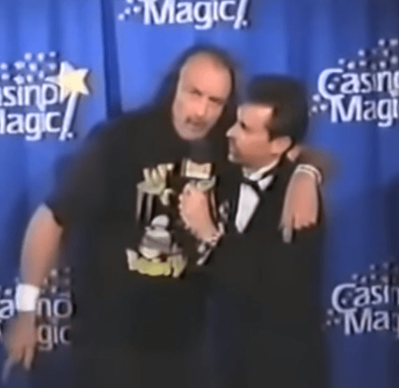 Match Six: Abdullah the Butcher VS The One Man Gang. There is absolutely zero wrestling in this farce. Within about two minutes both guys have bladed and are bleeding heavily, and I’m reasonably sure that Abdullah was still dealing with Hepatitis C at this point and told no one. Poor Randy Rosenbloom, who is completely new to this I remind you, doesn’t know what to say, as both fat guys crash onto the announcers’ table and smear him with blood to lead to a double count-out and a thankfully quick ending.