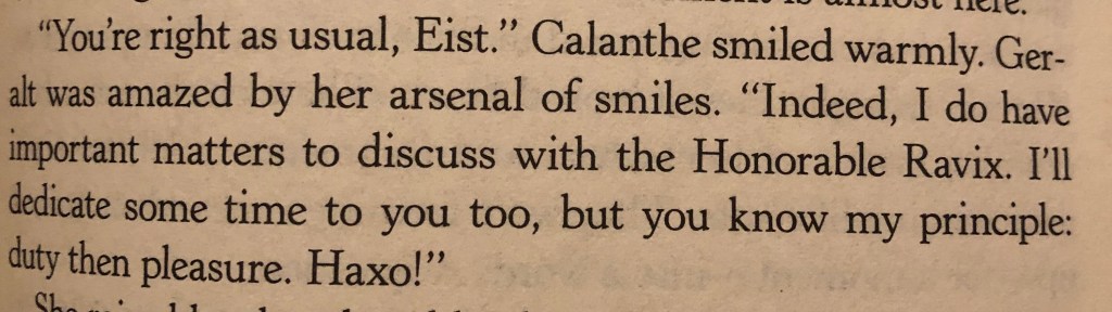 Nenneke is my hero. The temple of Melitele is her domain and she protects it ferociously. She takes in and teaches young women to be oracles and midwives and healers. She’s experienced and knowledgeable enough as a healer that Geralt trusts her implicitly to re-treat his already almost-healed wound. She’s short and fat and swift and graceful and skilled. I’m twenty-four years old and Nenneke is who I want to be when I grow up. Oh. the things I wouldn’t do for a book that dives more deeply into Nenneke’s backstory and her day-to-day running of the temple. I could read an entire novel on it.