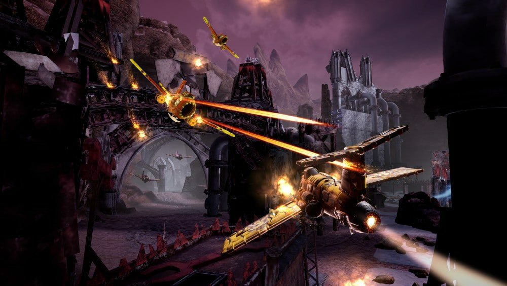 We wanted to keep the game close to the ground to capture the feel of ork flyers zooming across a battlefield. This means that you’ll have plenty of obstacles to fly around to get enemies off your tail and that you’ll have plenty of interesting flying moments as you zoom through imperial ruins, red rock canyons, and lava caves.