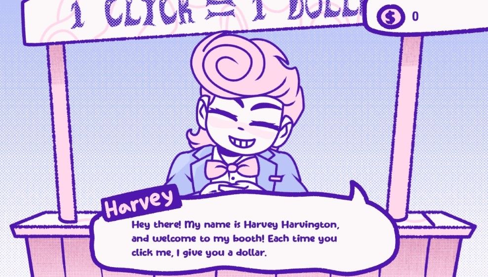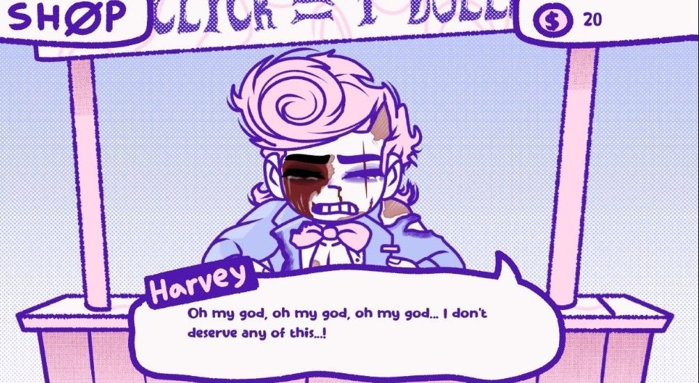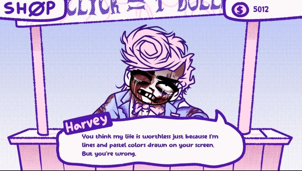 Unfortunately for Harvey, humanity can be pretty heartless in the face of zero repercussions. After all, why sit for over an hour clicking 25,000 times when you can earn more money much faster using the weapons unlocked in the shøp? I mean, why have the weapons available at all if not to be used? And Harvey makes it perfectly clear that these mere weaponized clicks cause him tremendous pain. He often begs you to stop, pleads for his life, and even breaks the 4th wall when it comes to his existence and how it has purpose despite being an animation in a video game. Cold.