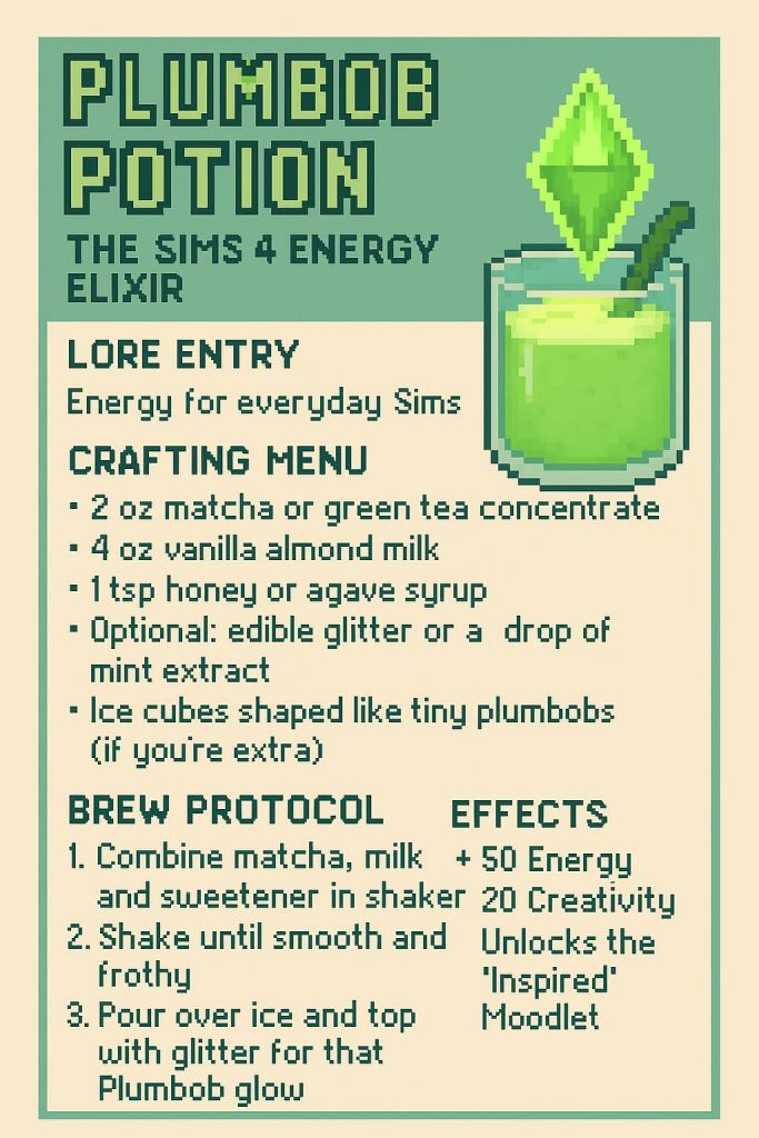 Whether you’re managing chaos in a digital household or pulling an all-nighter building your dream mansion, every Sim needs one thing: energy. Inspired by the glowing Plumbob, this pastel-green drink captures the chill-yet-productive vibe of The Sims 4: sweet, bright, and ready to boost your Moodlet from “Exhausted” to “Inspired.”