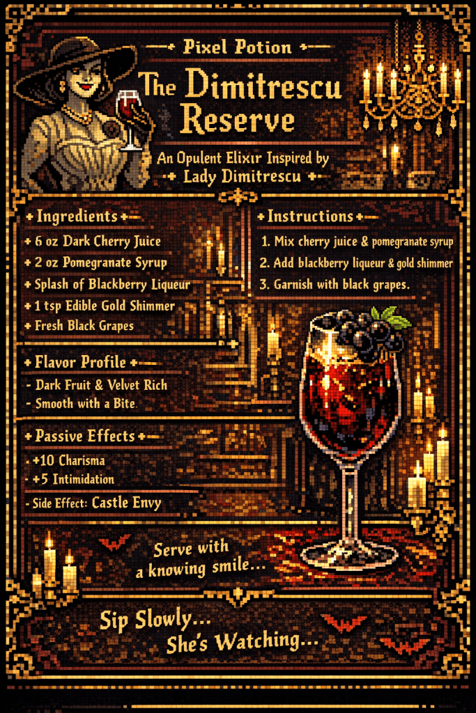 This potion embodies everything Lady Dimitrescu represents: luxury, dominance, and an elegance that borders on terrifying. It’s not meant to comfort. It’s meant to captivate!